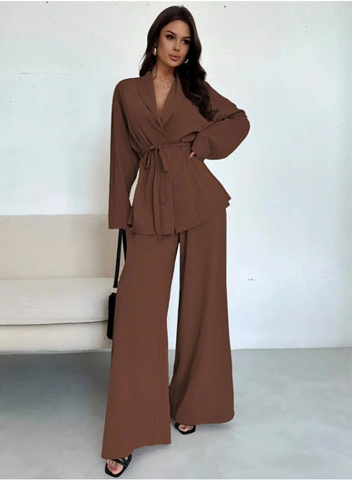 Das Set kombiniert ein locker fallendes Oberteil mit einer weit geschnittenen Hose und eignet sich für Büro, Besprechungen und formelle Anlässe.